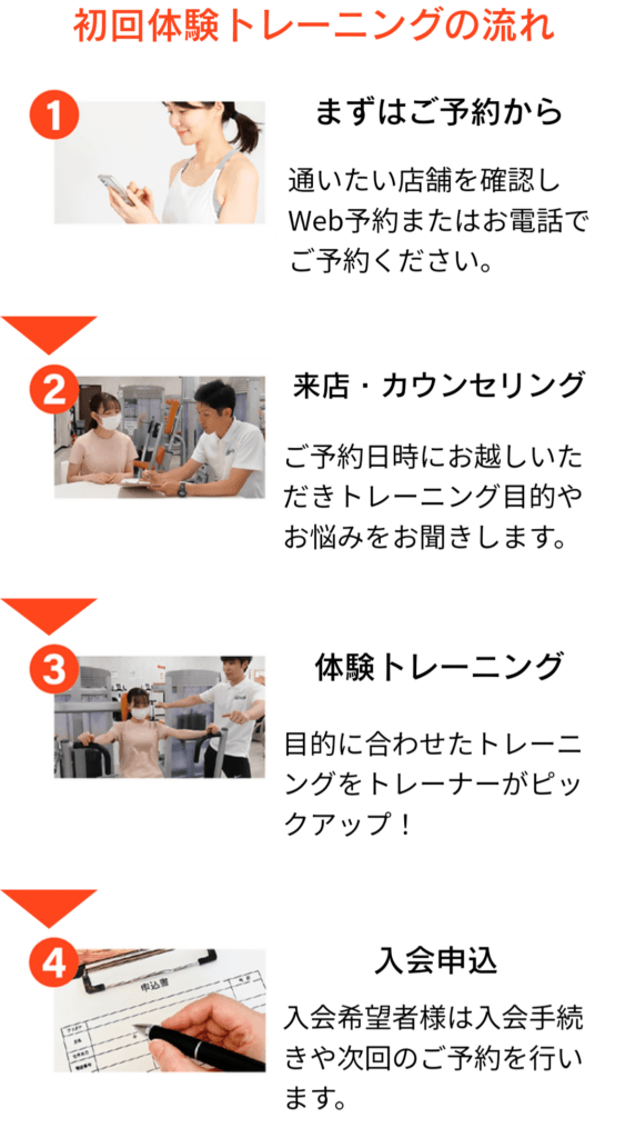 見学には必要ございませんが、マシンを体験する場合には動きやすい格好と室内用運動靴をご持参下さい。
